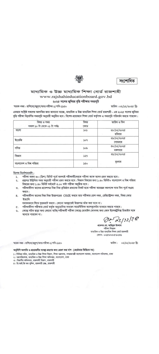 জুনিয়র বৃত্তি পরীক্ষার ৩১ ডিসেম্বরের পরীক্ষা স্থগিত, নতুন তারিখ ৫ জানুয়ারি