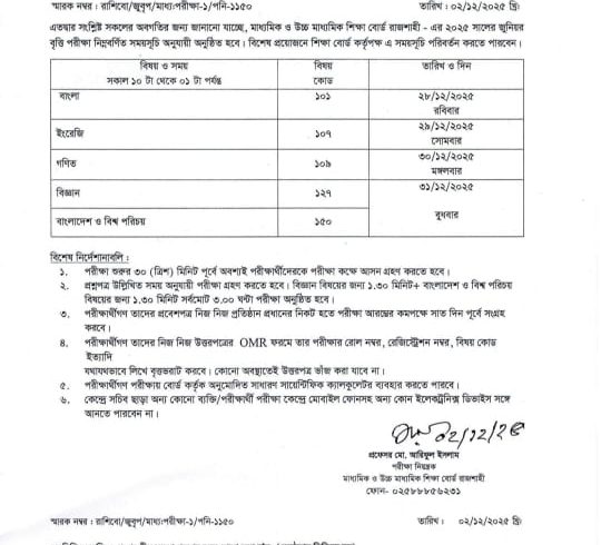 জুনিয়র বৃত্তি পরীক্ষার ৩১ ডিসেম্বরের পরীক্ষা স্থগিত, নতুন তারিখ ৫ জানুয়ারি